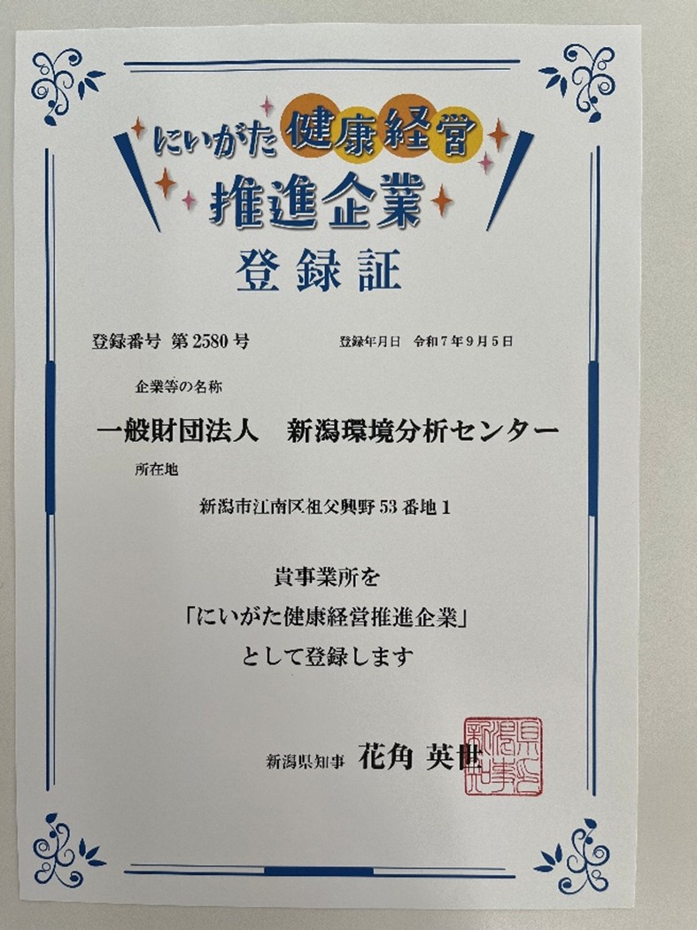 令和7年9月5日、一般財団法人新潟県環境分析センターは、このたび新潟県より 「にいがた健康経営推進企業」 として登録されました。